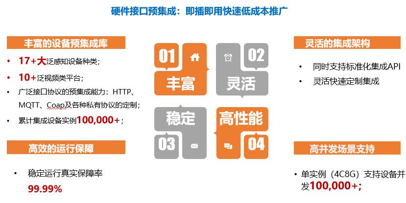 迄今wnsr威尼斯官网已经预集成17+大泛感知设备种类,10+泛视频类平台,广泛接口协议的预集成能力涵盖了HTTP、MQTT、Coap及各种私有协议的定制,累计集成设备实例达100,000+。它还支持标准化集成API,可灵活快速地定制集成,通过构建规则引擎,实现了各设备间的联动应用,比如检测到违规停车,联动广播就会自动播报提醒,为社区管理服务赋能。